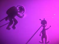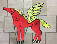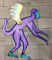 Session 2: Construction of puppet: Each child resumes work on their puppet. We pause at each step and demonstrate. Once pieces are cut out, joints are added with fasteners and hole punches. Control rods are added with straws and dowels. Finally, each child can customize their puppet with crayons and markers. At any point, they can bring their puppet behind the screen to see its shadow.