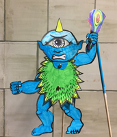 Session 1: Introduction to puppetry: We demonstrate the four most popular types of puppetry: Hand puppets, rod puppets, marionettes, and shadow puppets. We focus on shadow puppetry, giving a brief history of the art form. We talk about different light sources, shadows, silhouettes, opacity and transparency using examples. We perform a skit from Jack (or Jackie) and the Beanstalk which requires a volunteer, but no preparation. It is performed on an overhead projector with one tall weed or plant. Students are shown examples of the type of puppet they will make and select one of 12 templates. Each student cuts out the pieces for their puppet and stores them in a labelled bag.